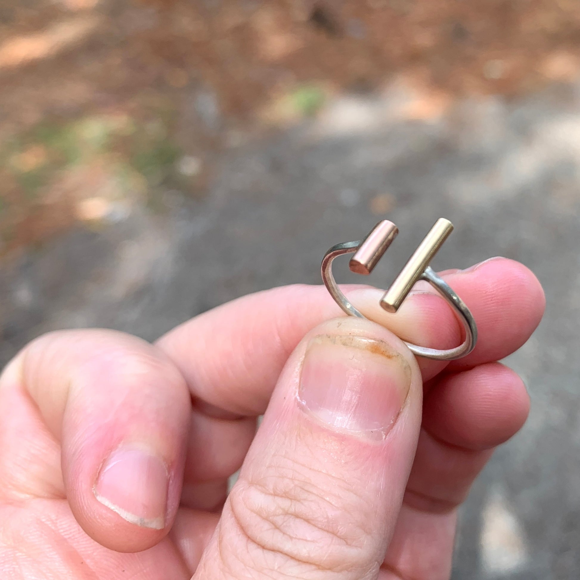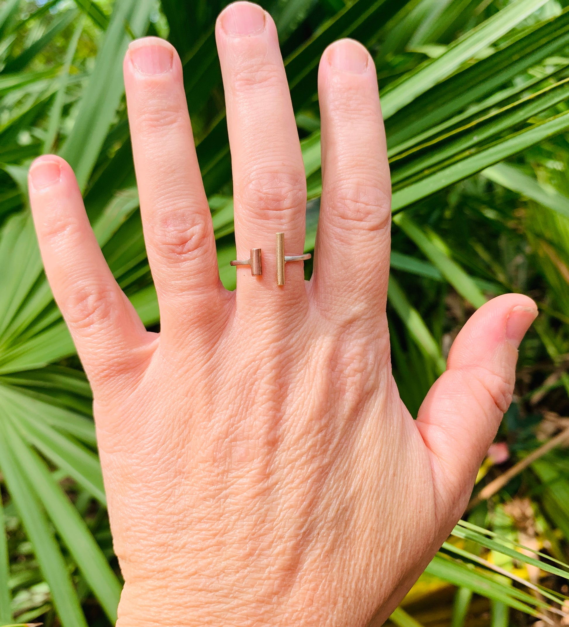 This modern double bar ring brings together mixed metals in perfect harmony. Two sleek bars- one in warm rose gold and the other in radiant yellow gold- rest side by side at different lengths, creating a balanced yet playful contrast. The bars are set on a polished sterling silver band, adding a cool-toned base that enhances the golden hues. Minimalist and contemporary, this ring makes a stubble statement with its clean lines and effortless elegance- a perfect everyday, comfortable piece with a touch of artful sophistication.
