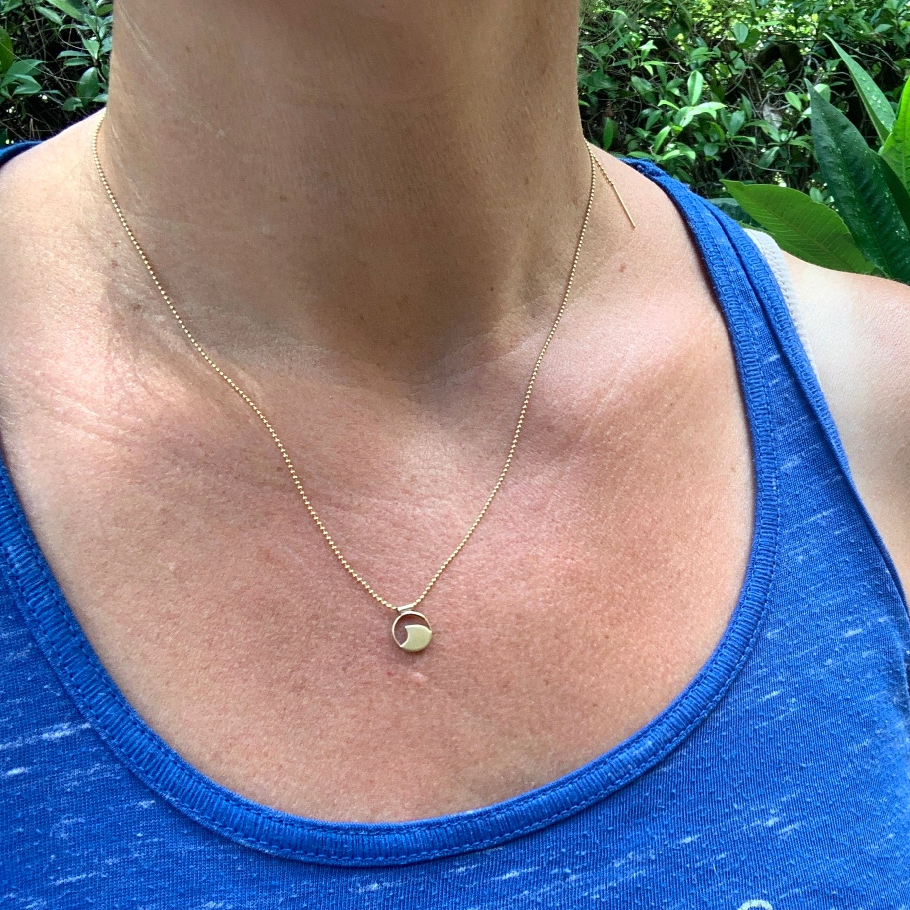 Delicate and full of meaning, this minimalist necklace features a tiny 10k gold wave charm suspended on an adjustable yellow gold filled chain. Inspired by the gentle rhythm of the ocean, it's perfect for layering or wearing a solo as a subtle nod to your love of the sea. Lightweight, timeless, and designed to move with you, this piece brings a little coastal calm wherever you go.