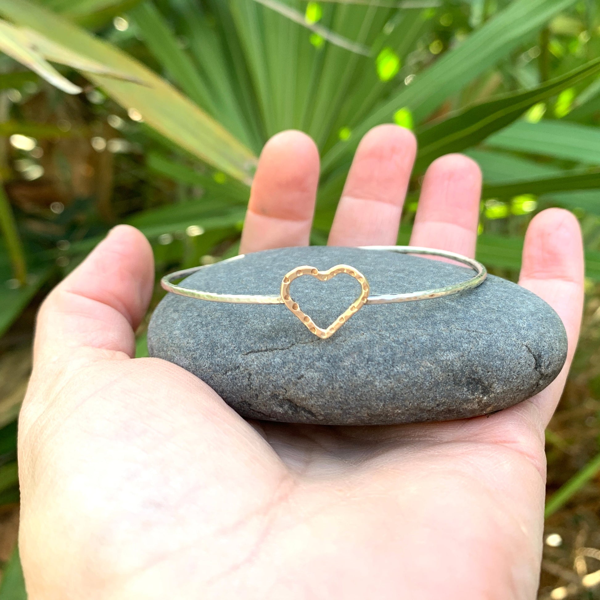 The love you bangle is a beautiful symbol of love and connection. Crafted from solid 10k gold and sterling silver, it features a minimalist design with a delicate, textured heart at it's center. Whether it's worn alone or stacked with others, this bracelet will add a touch of charm to any outfit. Perfect as a thoughtful gift or a personal keepsake, this will be your new favorite accessory.