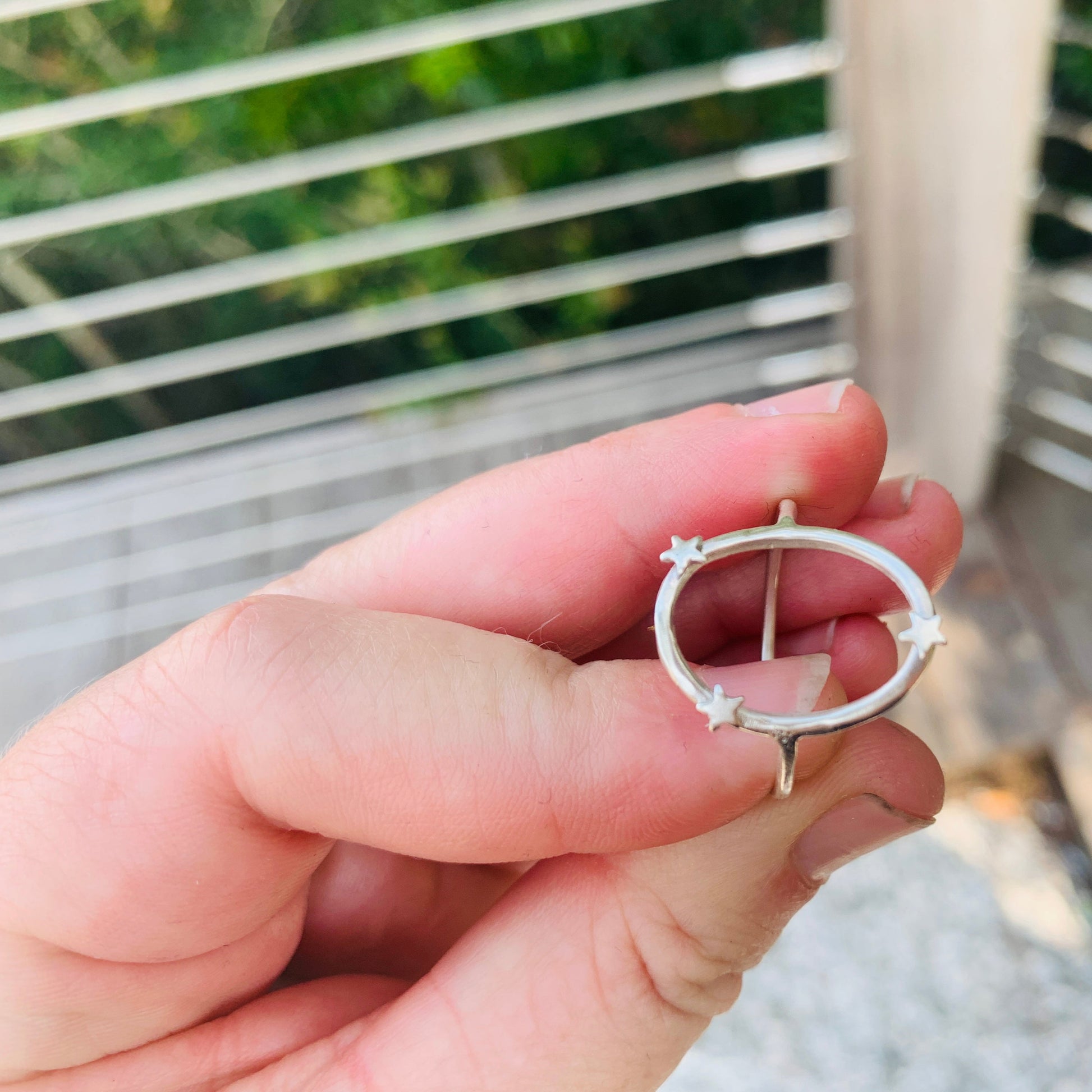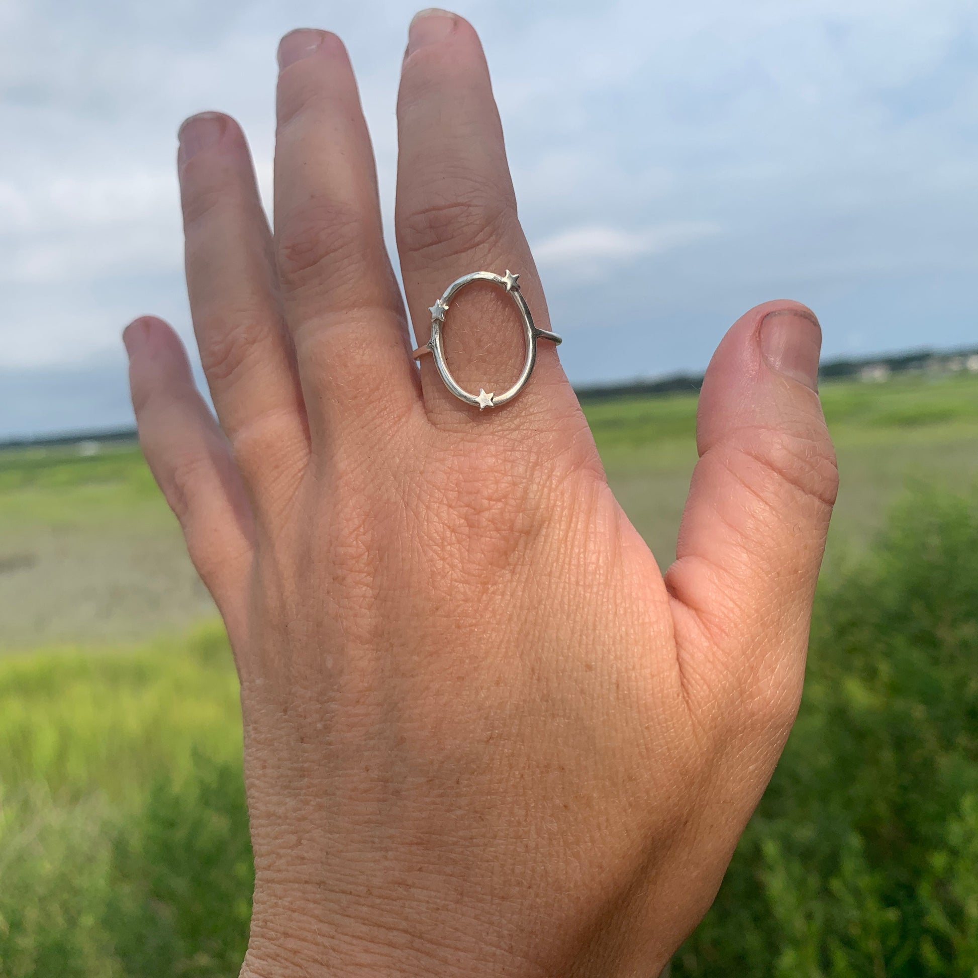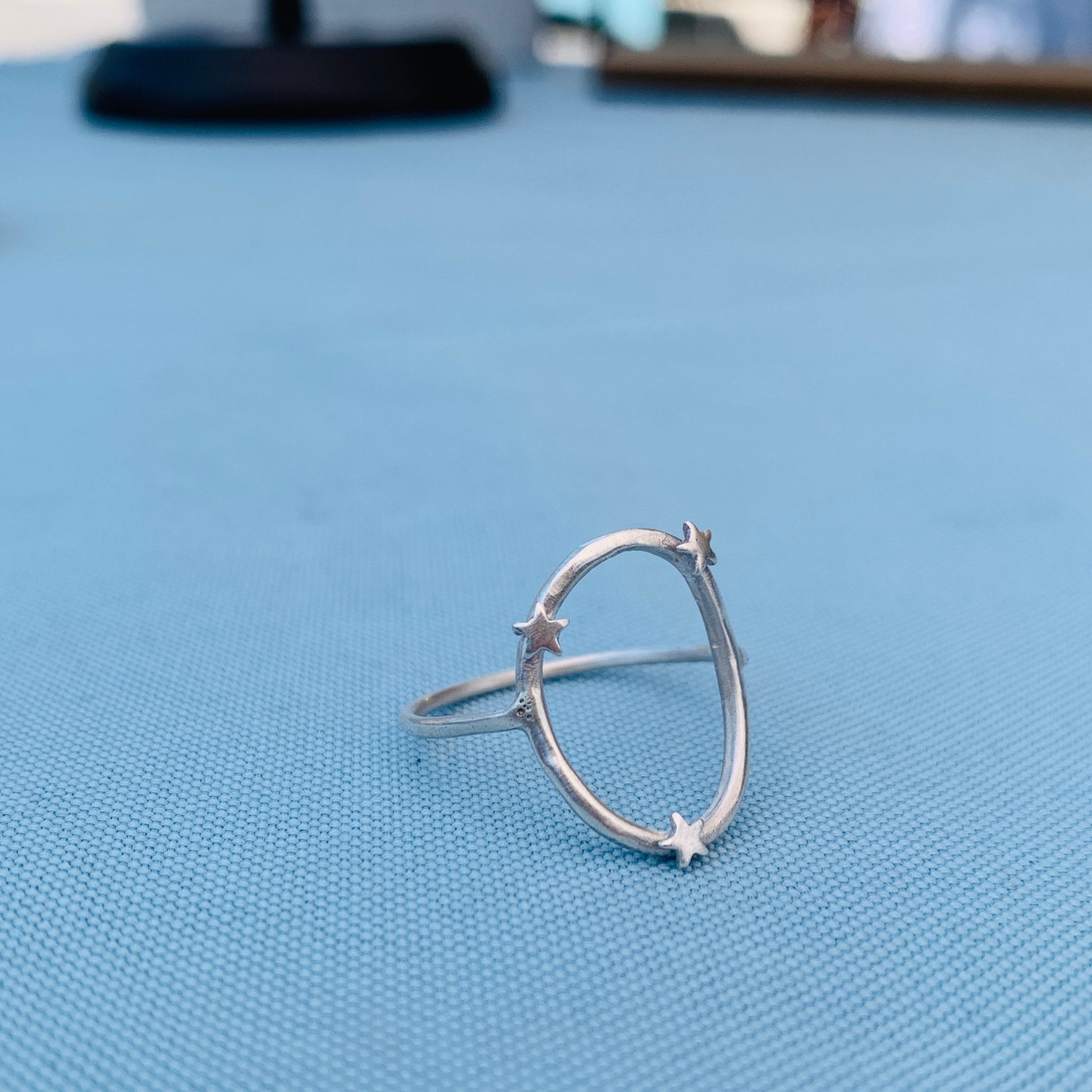 This sleek and minimal sterling silver oval ring accented with three delicate star details will be the perfect addition to your ring collection. The smooth oval shape created a clean, modern silhouette, while the tiny star accents add just a touch of sparkle and charm. Perfect for everyday wear , this ring is a subtle nod to celestial beauty.