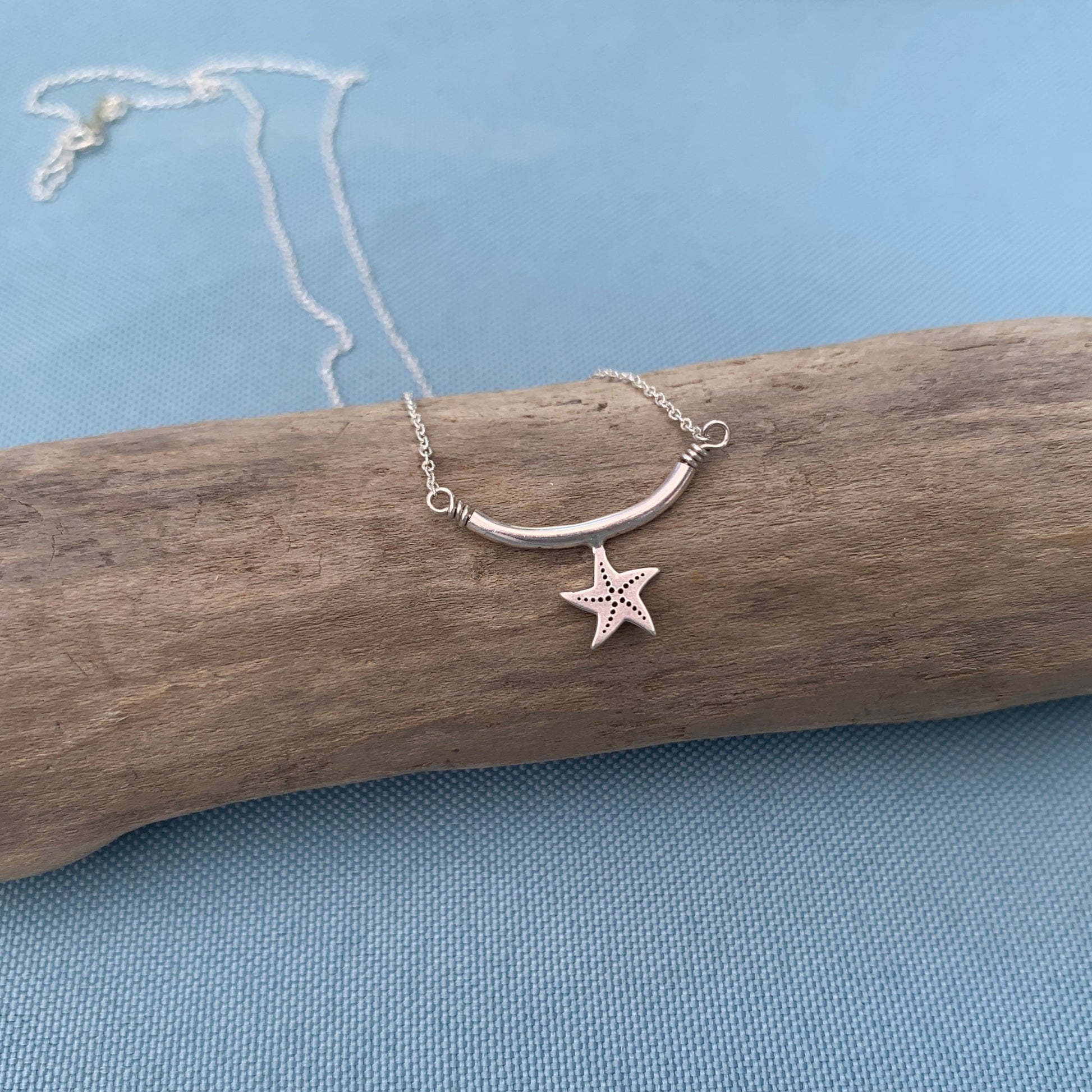 A tiny sterling silver starfish is delicately soldered to a sleek silver bar, creating a minimalist tribute to the sea. Suspended at the center of a sterling chain, this necklace captures the quiet beauty of ocean life with a clean, modern edge. Perfect for layering or wearing a solo as a subtle coastal statement.