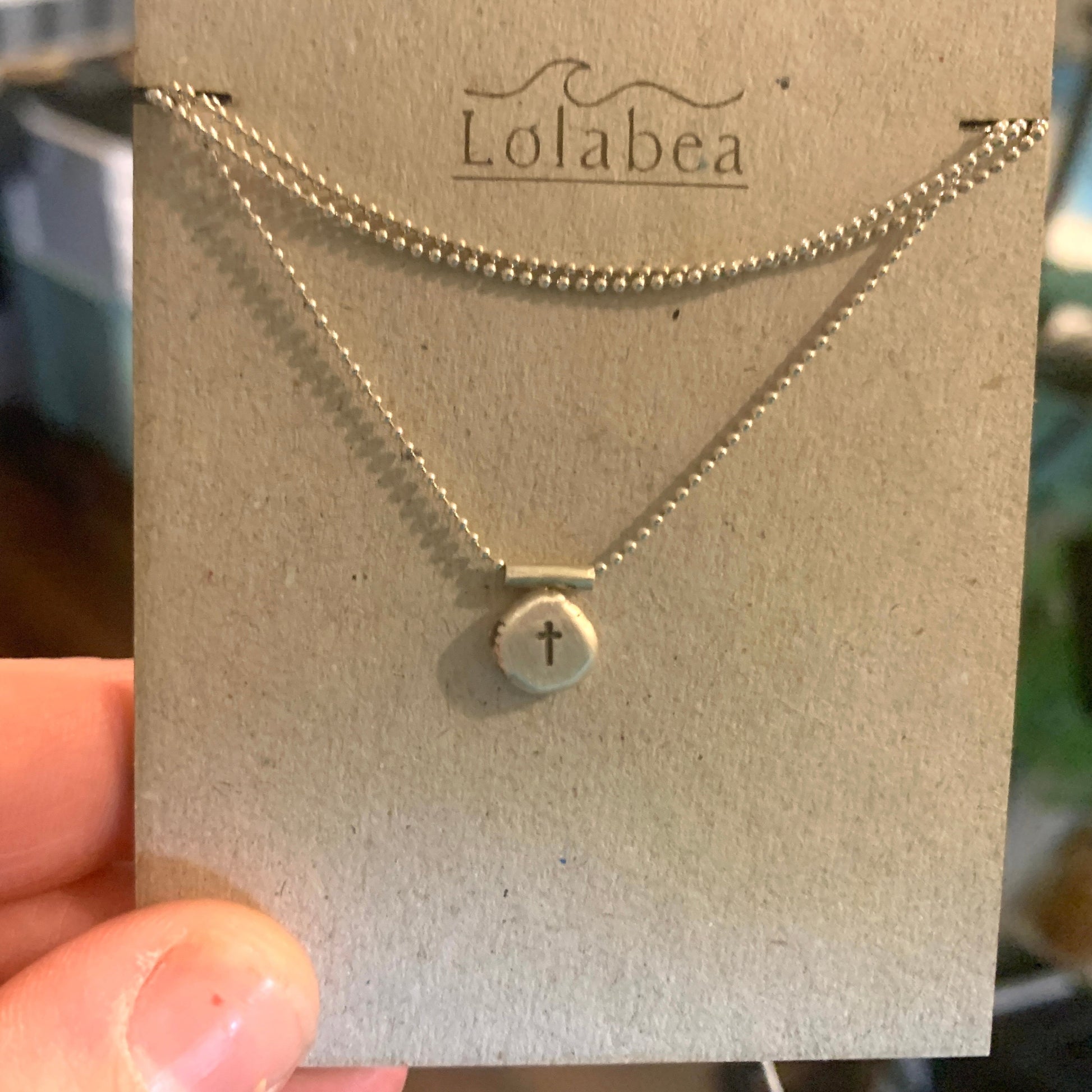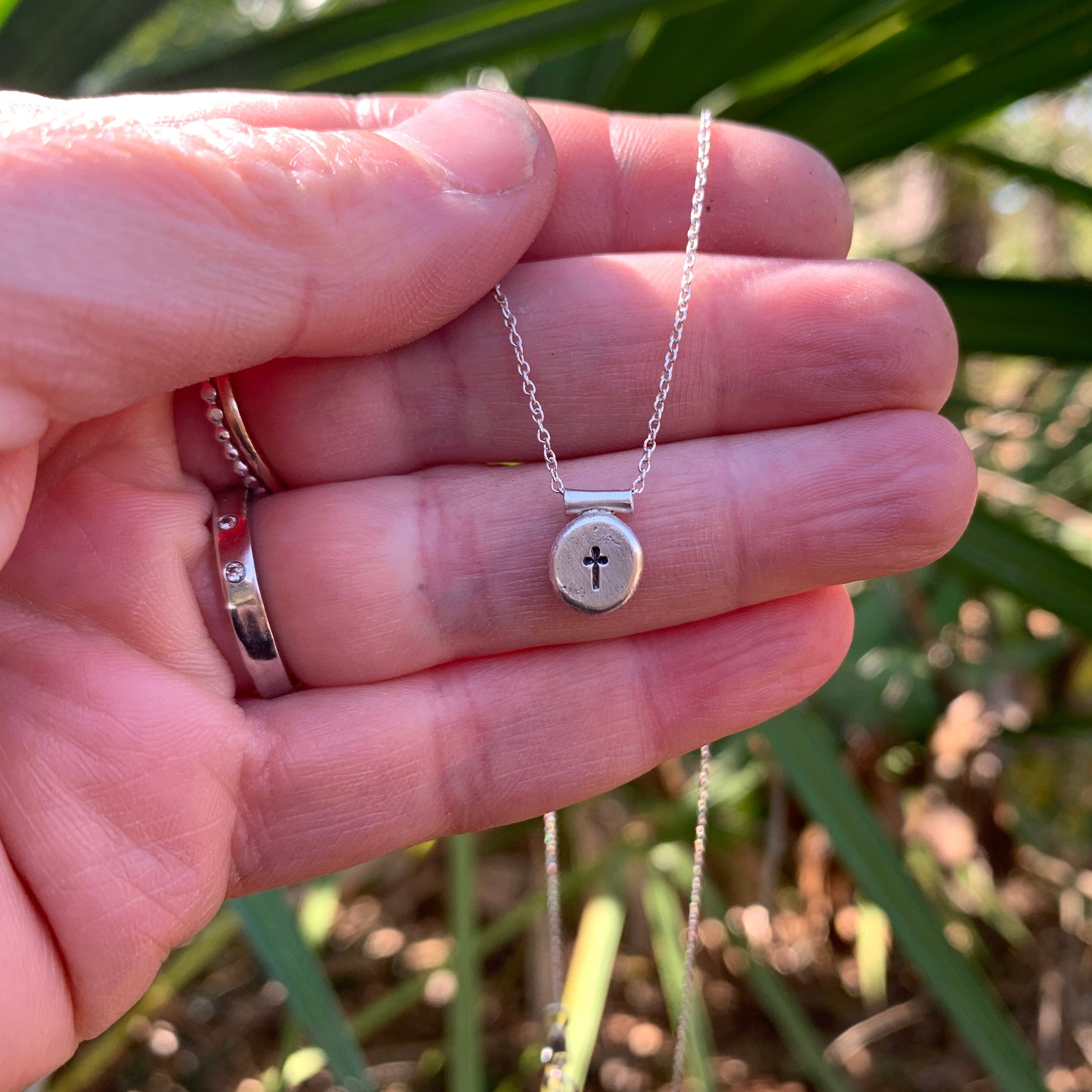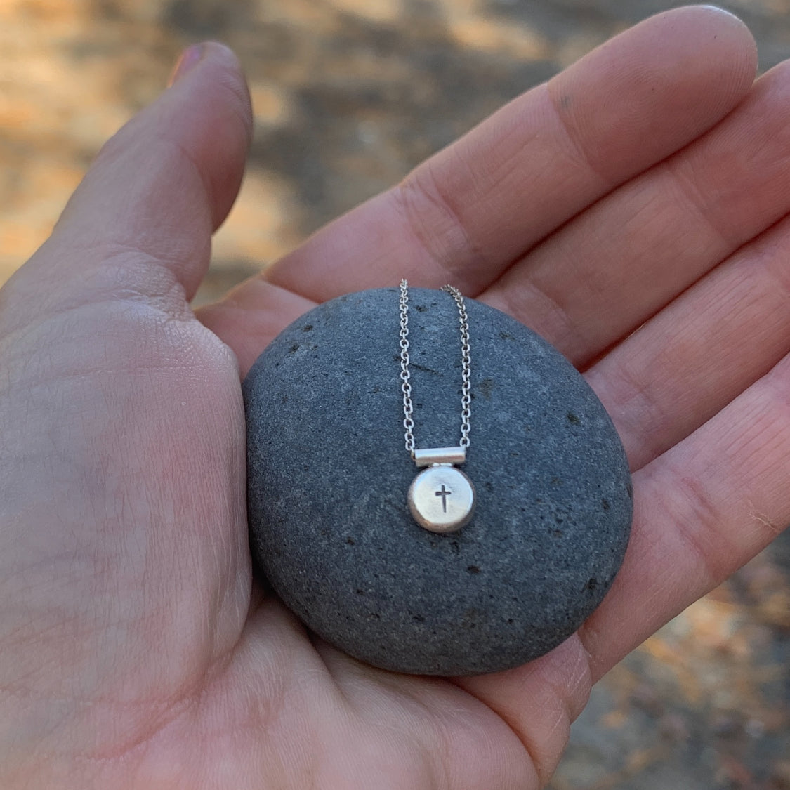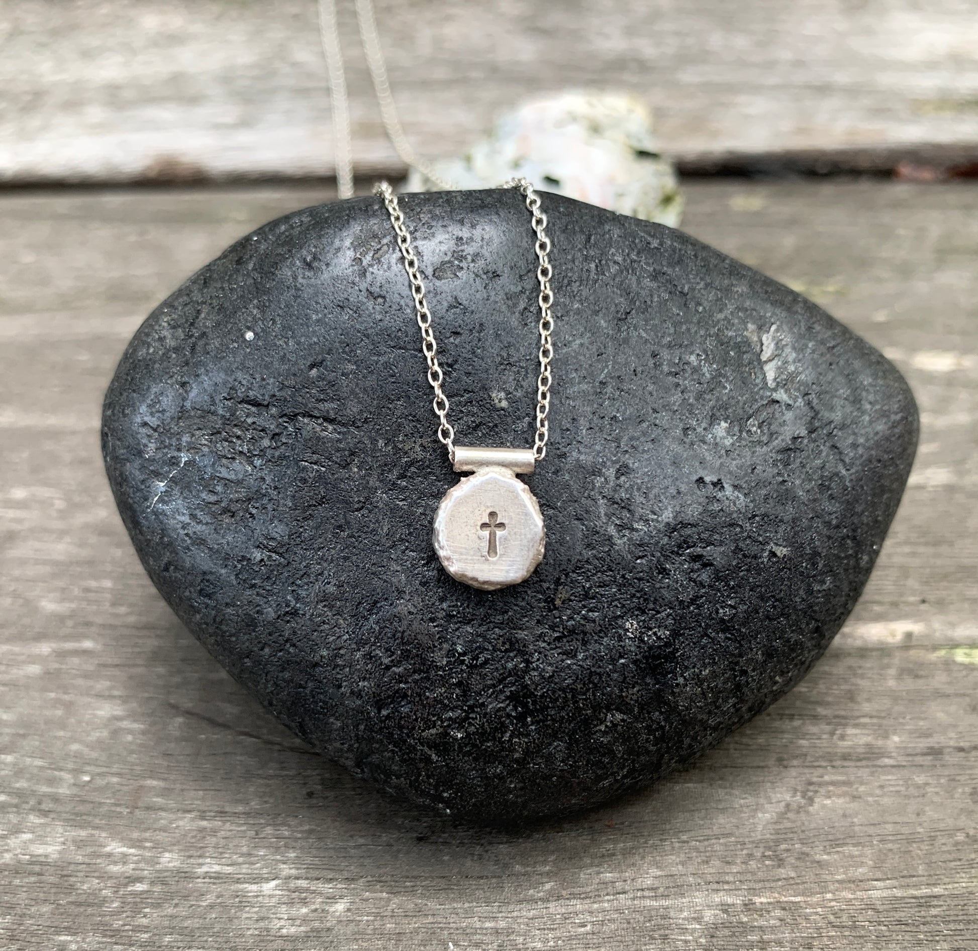 This petite silver cross necklace represents a blend of spirituality and the natural world. The cross which symbolizes faith and hope is stamped on a hand forged silver nugget symbolizing the organic forms of the ocean. The sweet little pendant sits on a 17" sterling silver delicate but sturdy chain.