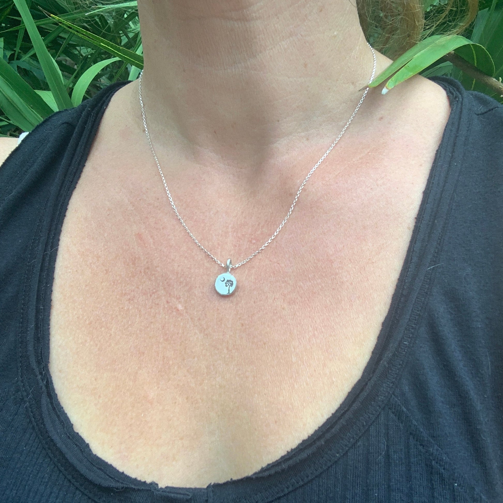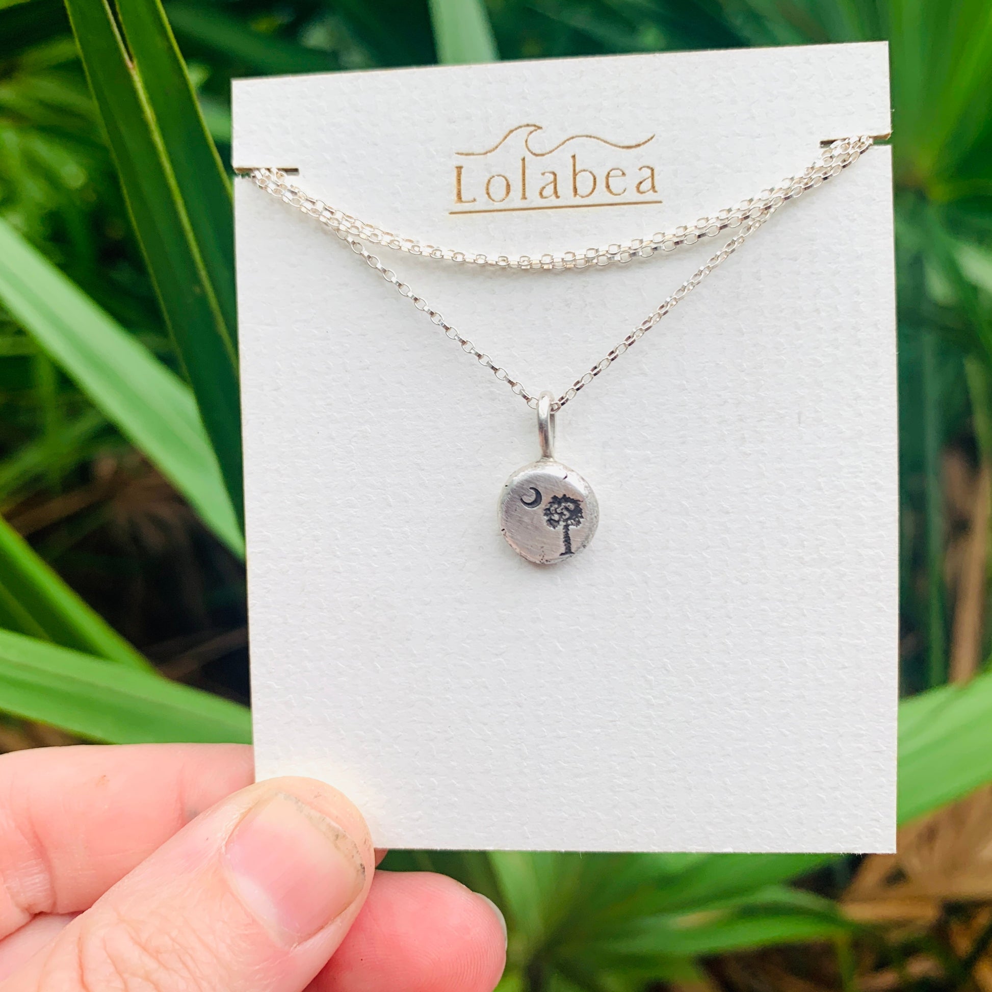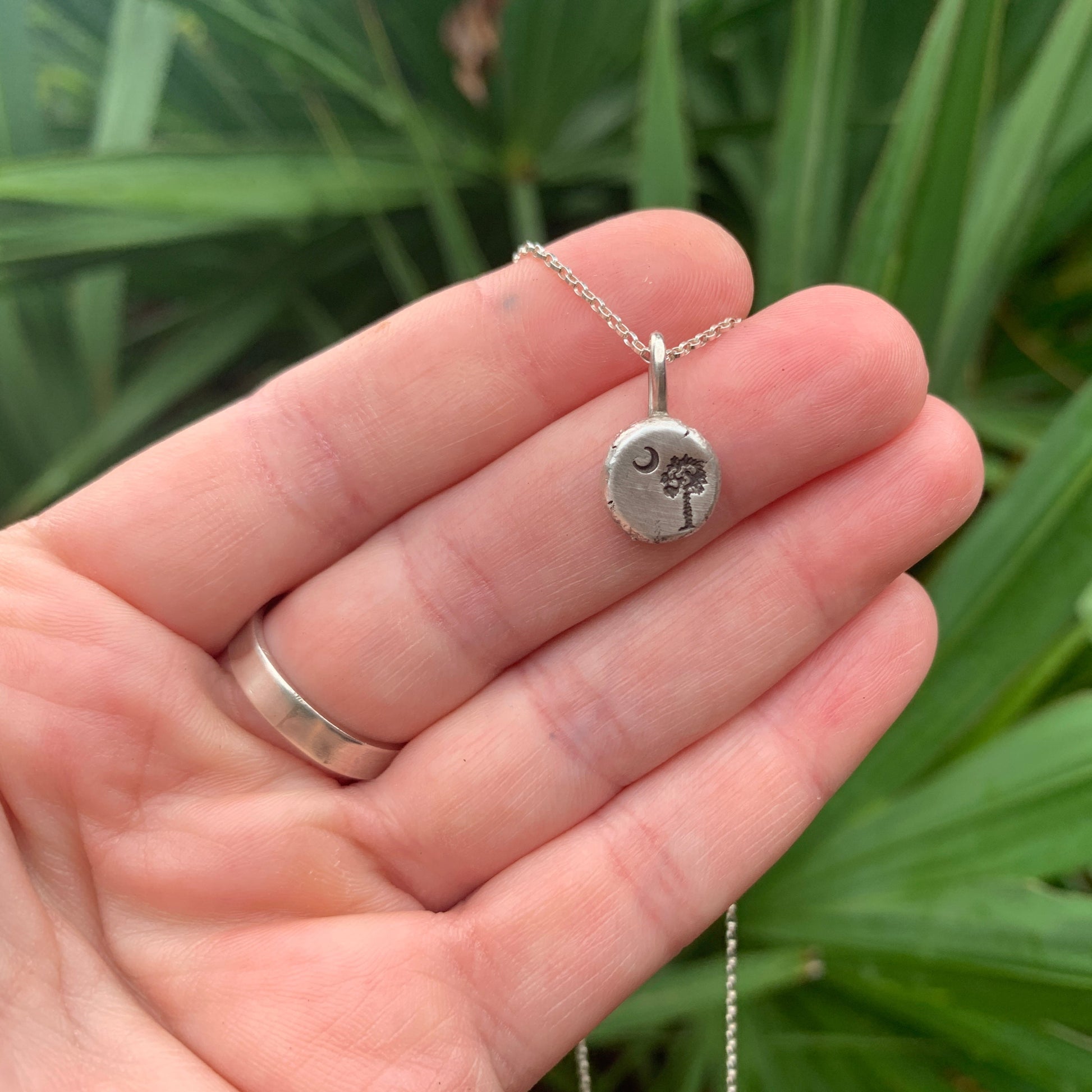 This handcrafted sterling silver necklace features a delicately hand stamped palmetto tree- a proud symbol of South Carolina's coastal beauty. Simple and timeless, it captures the spirit of ocean breezes, southern charm, and resilience. Perfect for everyday wear or as a keepsake that celebrates home.