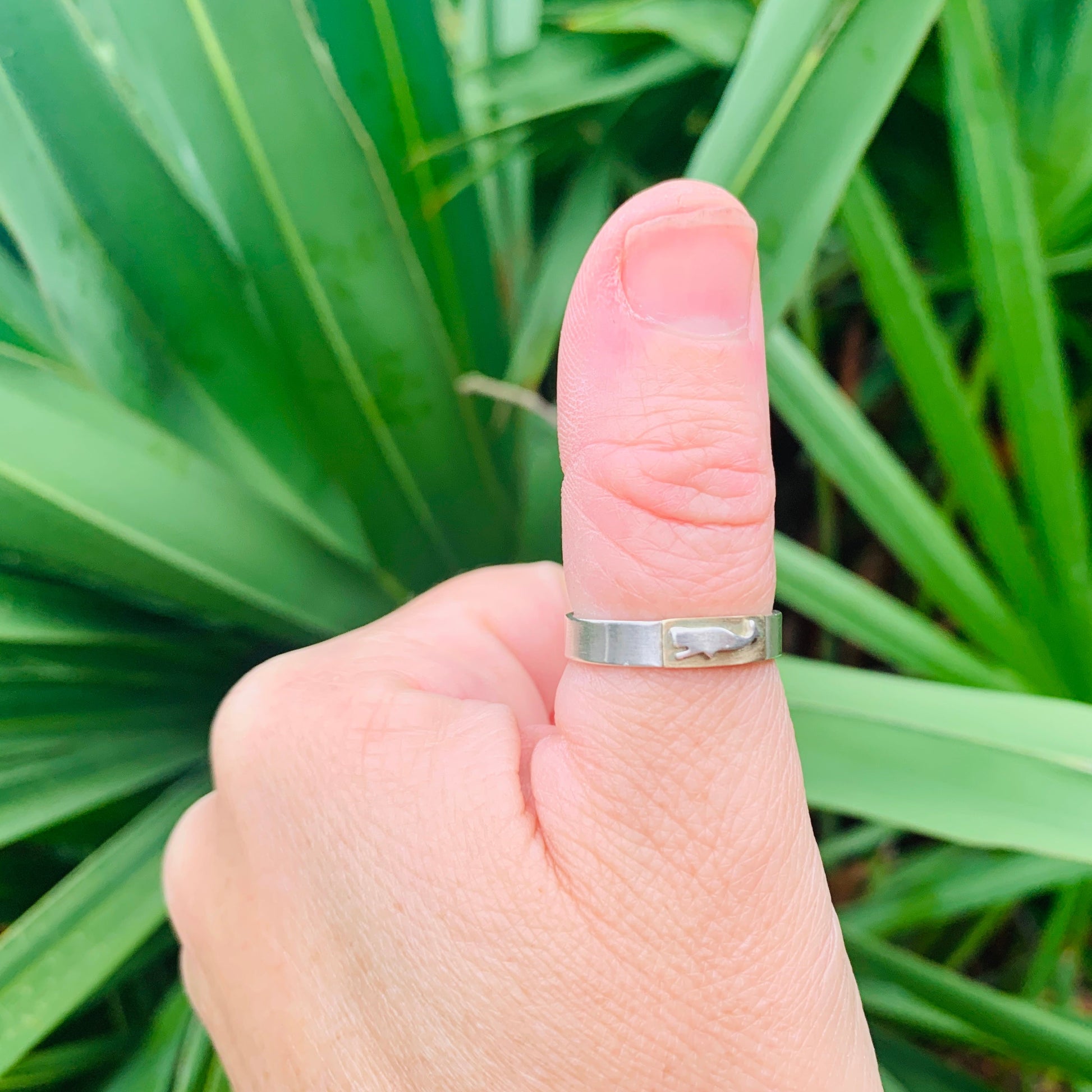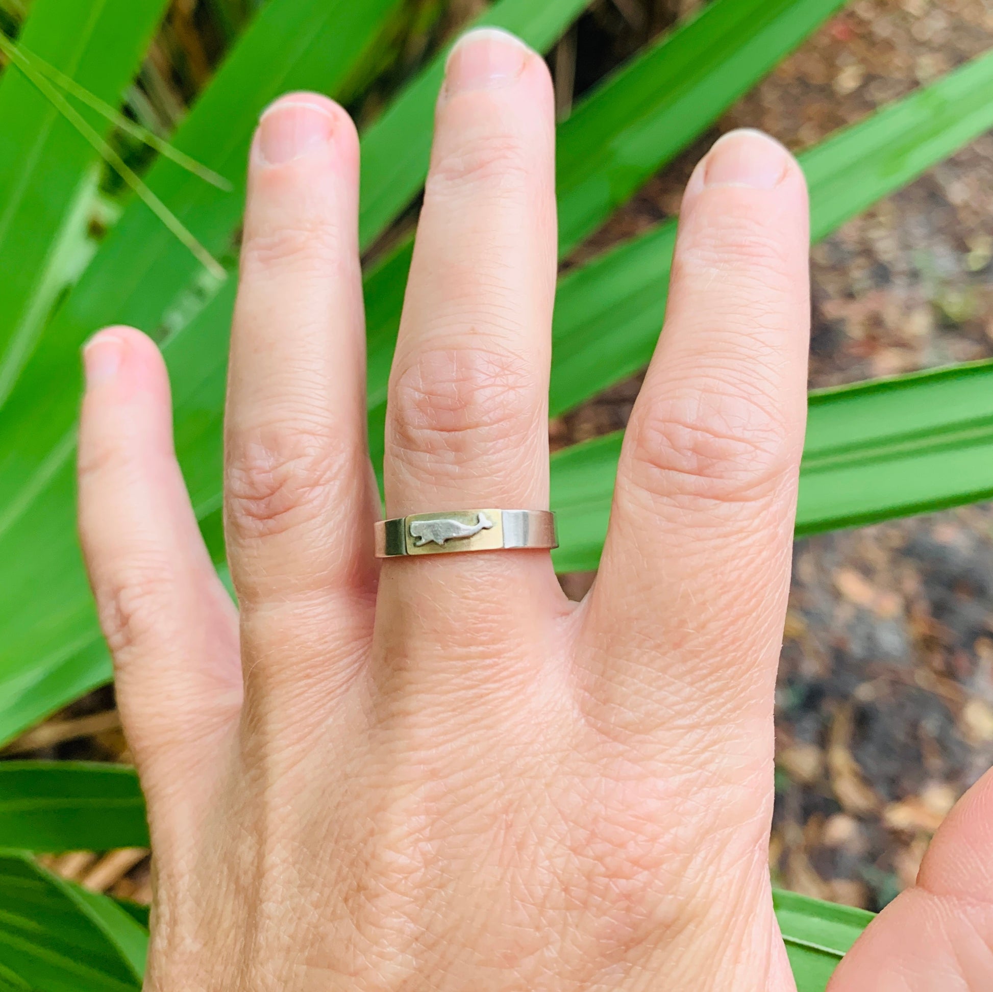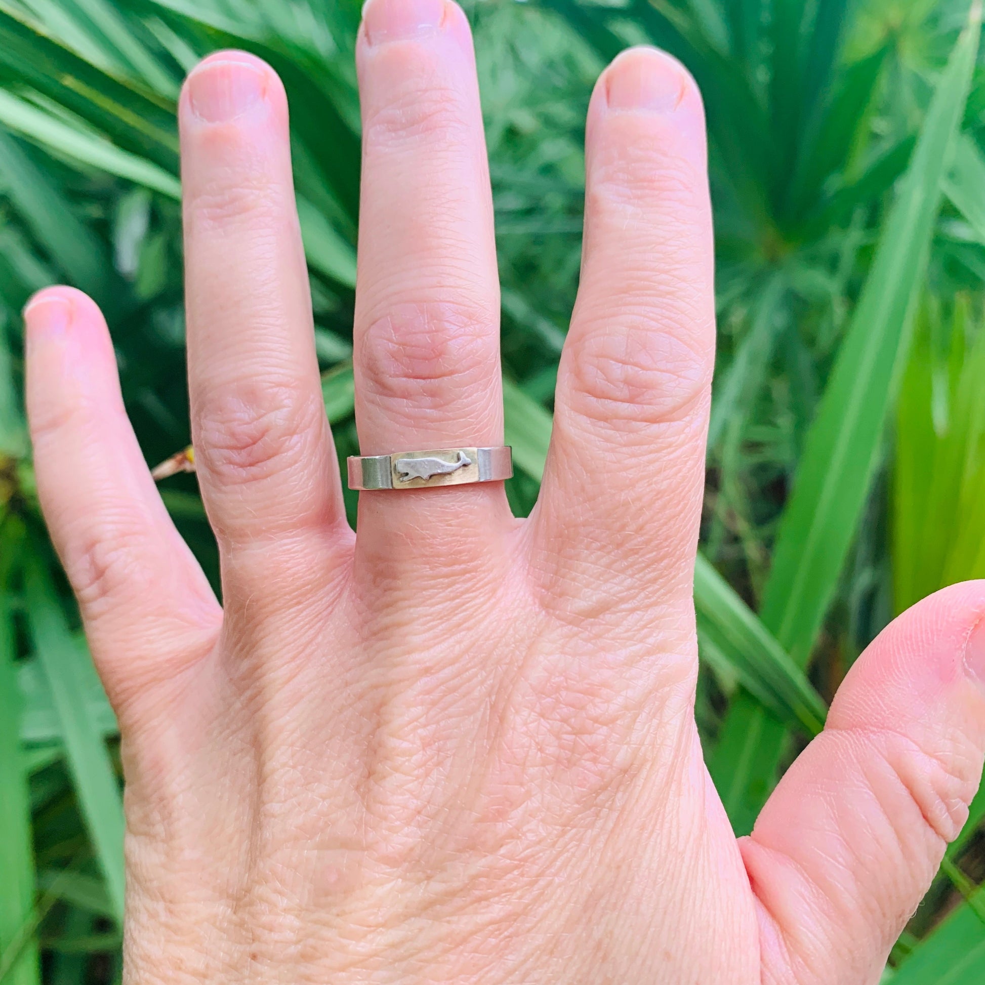 Inspired by the beauty of the ocean, this handcrafted sterling silver band features a graceful whale as its centerpiece-- a symbol of wisdom, strength, and serenity. A touch of warm, gold accent adds contrast and elegance, evoking sunlight glinting off the waves. Smooth, comfortable, and full of meaning, this ring is a subtle tribute to the sea and its gentle giants.